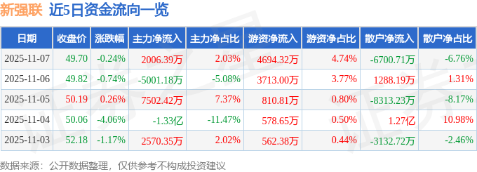 11月7日的资金流向数据方面,主力资金净流入2006.39万元,占总成交额2.03%,游资资金净流入4694.32万元,占总成交额4.74%,散户资金净流出6700.71万元,占总成交额6.76%。